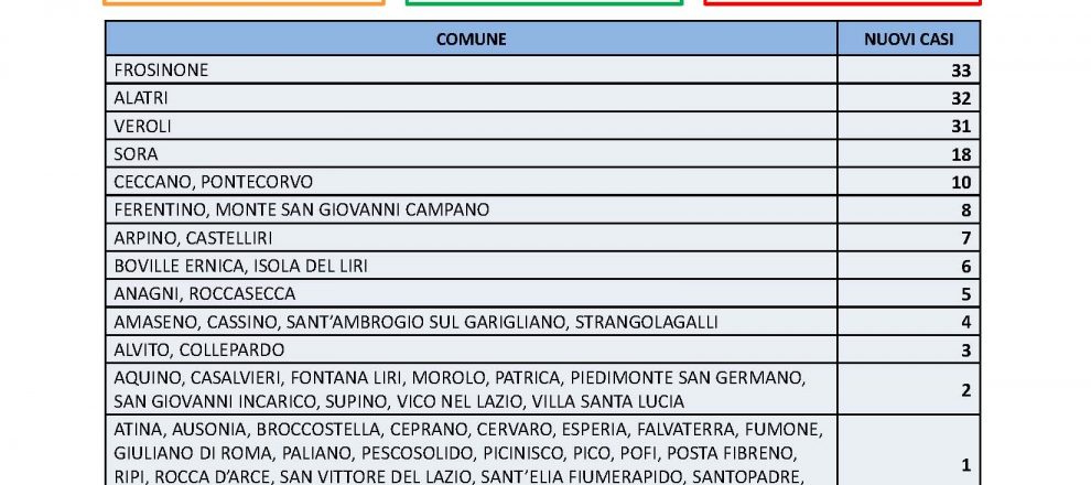 Il record del giorno è per la città di Frosinone con 33 nuovi casi, segue Alatri con 32 e Veroli 31.