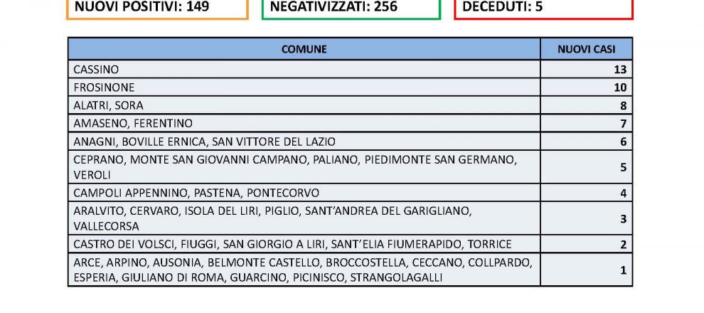 Il maggior numero di positivi è stato registrato a Cassino con 13, seguno Frosinone con 10, Alatri e Sora 8, 7 i nuovi casi ad Amaseno e Ferentino.