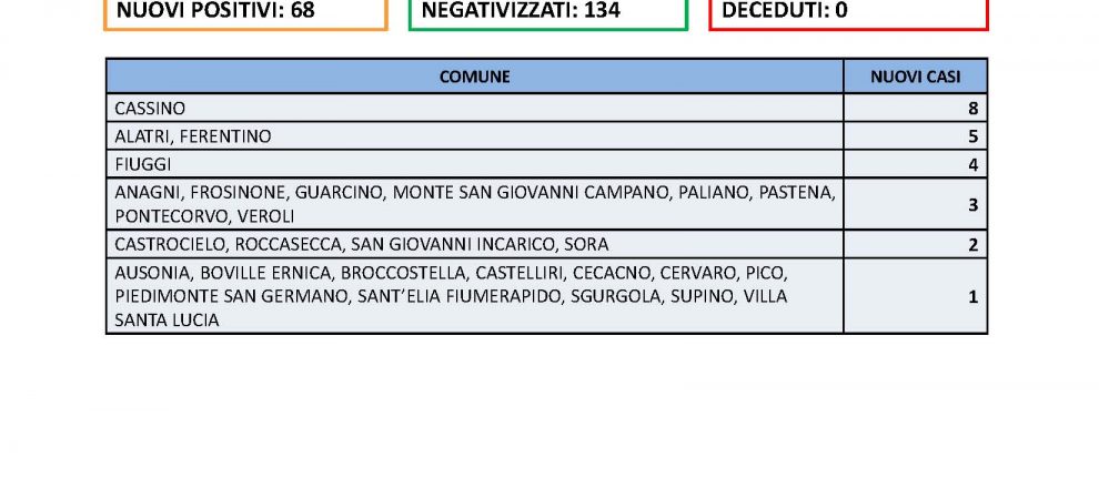 FROSINONE – 30 APR – Zero decessi in ciociaria. Dopo tanto tempo, il dato che fa ben sperare è arrivato dal bollettino odierno della Asl di Frosinone. La curva resta stabile per il numero dei casi oggi a quota 68 su 2.037 tamponi processati. Il tasso di positività è 3,3%. E’ la città di Cassino a registrare il maggior numero di contagi con 8, Alatri e Ferentino 5, 4 per Fiuggi, 3 casi ad Anagni, Frosinone, Guarcino, Monte San Giovanni Campano, Paliano, Pastena, Pontecorvo e Veroli.
