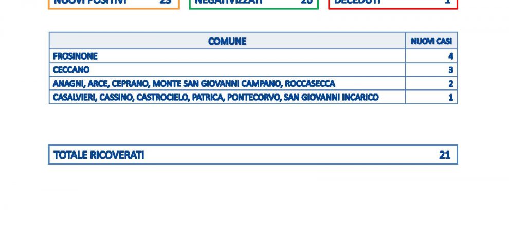 Registrato anche un decesso: una donna di 82 anni di Frosinone.