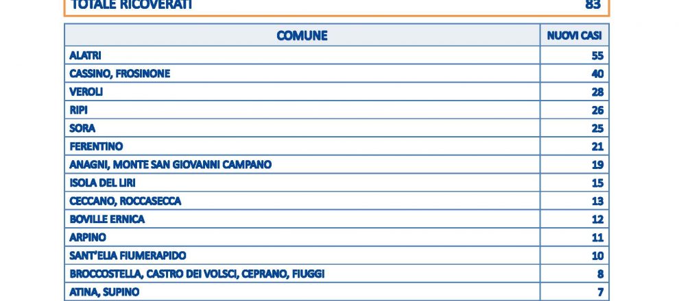 Frosinone – Oggi si contano 543 nuovi casi in provincia di Frosinone, si registra anche un decesso. Si tratta di un uomo di 92 anni di Anagni. Sono 3.938 i tamponi processati, i ricoverati sono 83, 1006 i guariti. Alatri è il comune che ha registrato il maggior numero di contagi con 55, seguono Cassino e Frosinone con 40, 28 a Veroli, 26 a Ripi, 25 a Sora. Dai 21 ad un caso sono coinvolti altri 67 comuni della provincia