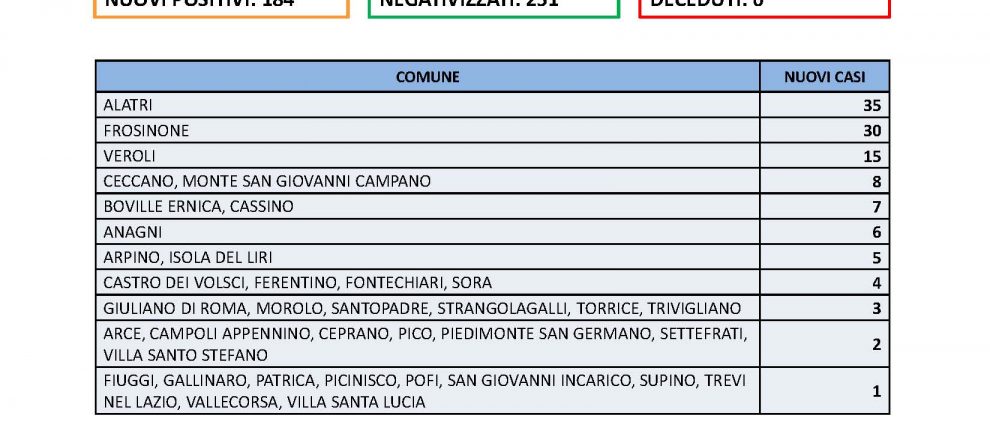 Il maggior numero di casi si è registrato ad Alatri a quota 35, seguono Frosinone a 30 e 15 a Veroli.