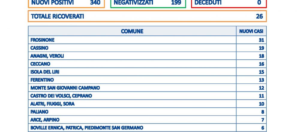 FROSINONE – Sono 340 i nuovi casi in provincia di Frosinone su 1.360 tamponi processati. Non risultano decessi, i guariti sono 199, 26 i ricoverati. Il comune che ha registrato il maggior numero di contagi è Frosinone a quota 31, seguono Cassino con 19, Anagni e Veroli con 18. Dai 16 ad un caso sono coinvolti altri 54 comuni.