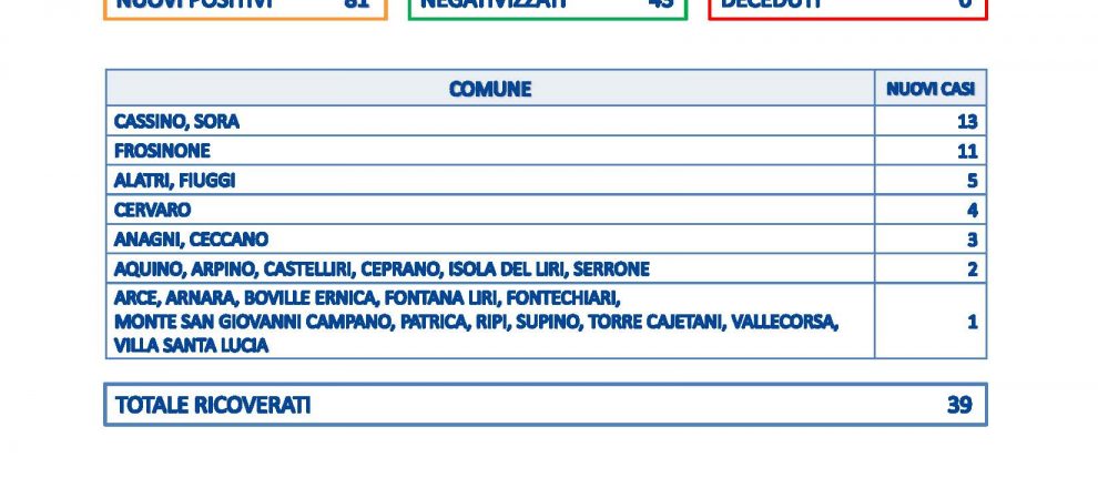 Frosinone – Sono 81 i nuovi casi in provincia di Frosinone su 1599 tamponi processati. Il tasso di positività è del 5,06%. Restano 39 i ricoverati, non risultano decessi. I guariti sono 43. I Comuni con il maggior numero di casi sono Sora e Cassino con 13, segue Frosinone con 11.