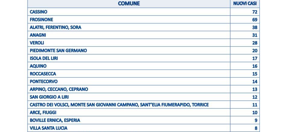 I ricoverati sono 82, 8 in terapia intensiva. Sono stati registrati 3 decessi: Uomo età 88 di Ceccano; Donna età 96 di Frosinone; Donna età 84 di Frosinone.