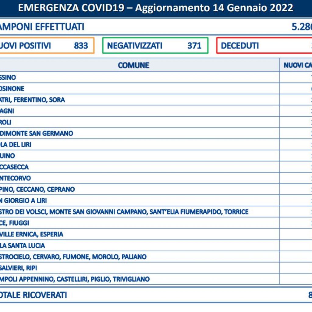 FROSINONE – 14 GEN – I nuovi positivi in provincia di Frosinone sono 833 su 5286. Il tasso di positività è al 15,7%