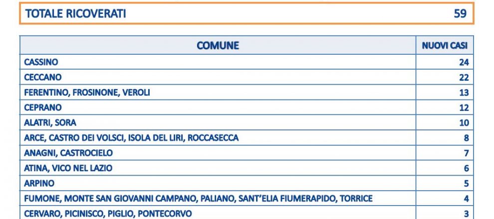 La città con più contagi è Cassino a quota 24, seguono Ceccano con 22; Ferentino, Frosinone e Veroli con 13. Poi sono 12 a Ceprano, 10 ad Alatri e Sora. Sono 53 i comuni con almeno un caso.