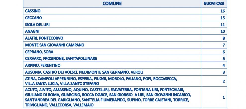 C’è Cassino in testa con 16 contagi, seguita da Ceccano a 15 e Isola del Liri a 11. 10 casi ad Anagni, 8 ad Alatri e Pontecorvo. 7 a Monte San Giovanni Campano. 6 a Ceprano e Sora.