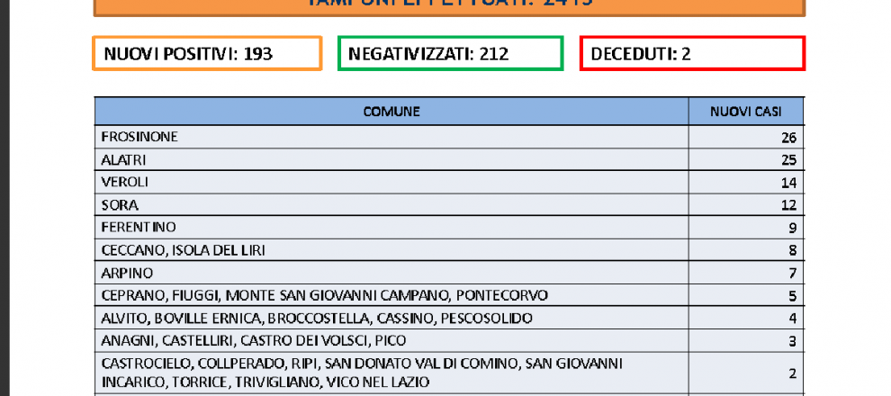Sono 193 i nuovi contagiati dal Covid in Provincia di Frosinone. I Tamponi processati sono stati 2413.il tasso di positività si attesta al 7,9%.