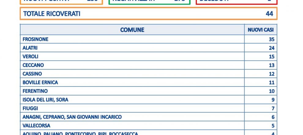 Dopo giorni c’è una vittima in provincia di Frosinone: si tratta di una donna di 85 anni di Alatri. i casi totali in Ciociaria sono 250, il tasso di positività è al 18,7% a fronte dei 1.333 tamponi processati. 44 i ricoverati.