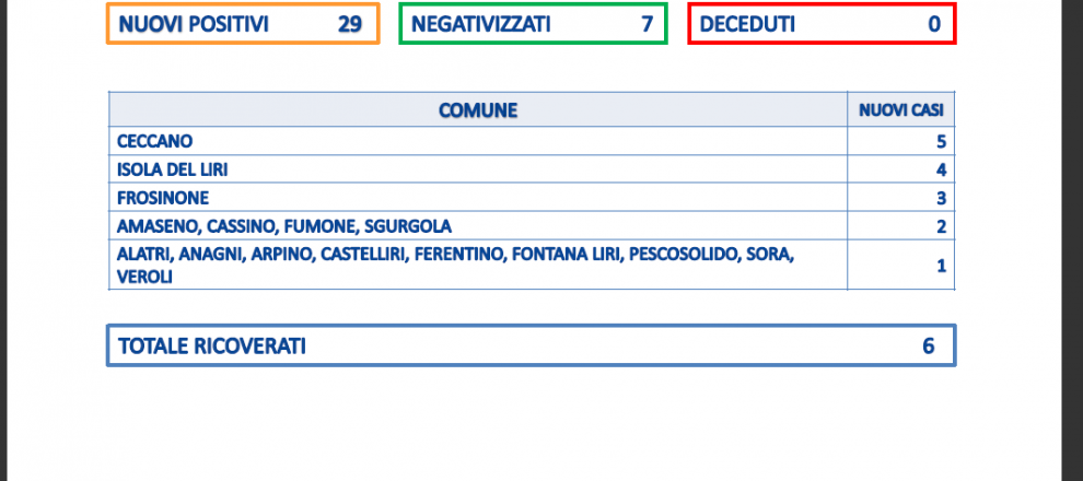 Sono 29 i positivi al Covid in Provincia di Frosinone su 941 tamponi processati. Il rapporto è al 3 per cento.