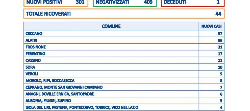 Un decesso in provincia di Frosinone dove i casi sono 301. il tasso di positività è al 14,4% a fronte dei 2.085 tamponi processati. La vittima è un uomo di 57 anni di Isola del Liri. 109 sono i guariti, 44 i ricoverati.
