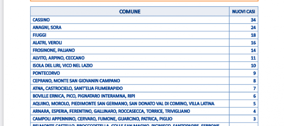 La città con più casi è Cassino: 34. Ce ne sono 24 ad Anagni e Sora.18 a Fiuggi. 16 ad Alatri e Veroli., 14 a Frosinone e Paliano. 11 ad Alvito Arpino e Ceccano. 10 a Isola del Liri e Vico nel Lazio