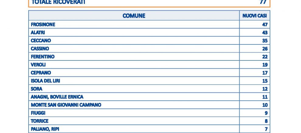 Frosinone conta 47 positivi, Alatri 43, Ceccano 35, Cassino 26, Ferentino 22. 62 gli altri comuni coinvolti dal contagio.