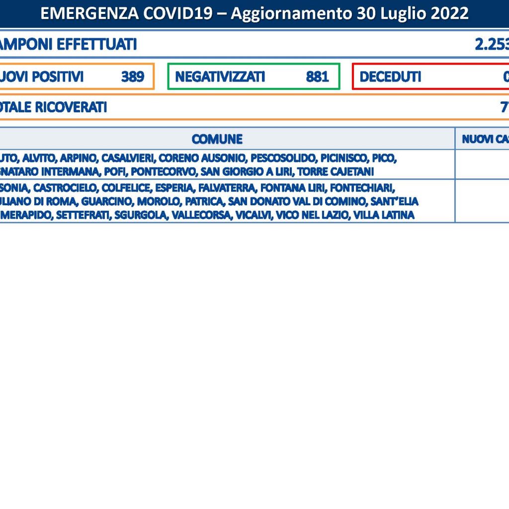 Zero decessi e 389 nuovi casi positivi in provincia di Frosinone. Il tasso di positività sale al 17,2% a fronte dei 2.253 tamponi processati. 881 i guariti, 77 i ricoverati.