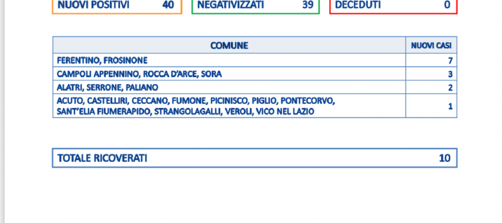 Salgono a 40 i casi Covid di giornata in Ciociaria. Ci sono anche due ricoverati in più. Si è passati da otto a dieci.