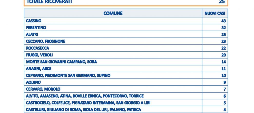 Cassino conta 43 positivi, Ferentino 32, Altri 25, Ceccano e Frosinone 23, Roccasecca 22, Fiuggi e Veroli 20. 54 gli altri comuni coinvolti dal contagio.