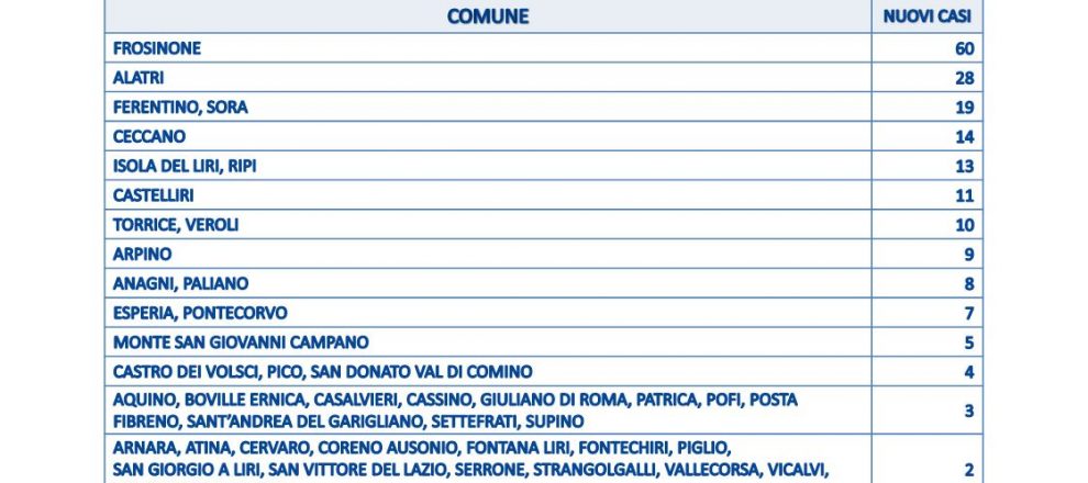 La città con più contagi è Frosinone 60; Alatri 28; Ferentino e Sora 19; Ceccano 14; Isola del Liri e Ripi 13; Castelliri 11; Arpino 9; Anagni e Paliano 8; Esperia e Pontecorvo 7; Monte San Giovanni Campano 5. Sono 41 comuni da 4 a 1 caso.