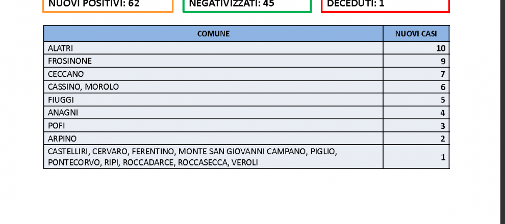 La città con più contagi di giornata è Alatri con 10. Frosinone 9. Ceccano 7. Cassino e Morolo 6. Fiuggi 5, Anagni 4. Pofi 3.
