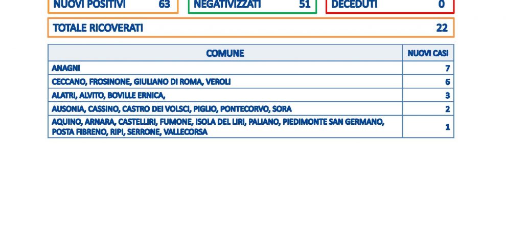 Zero decessi e 63 nuovi casi in provincia di Frosinone su 375 tamponi. Il tasso di positività è al 16,8%. 51 i guariti, 22 i ricoverati