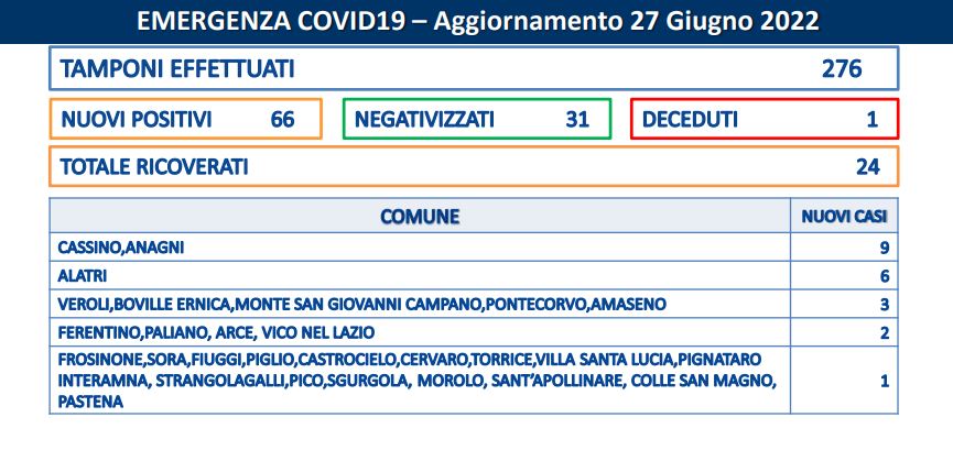 In provincia di Frosinone c’è una vittima: una donna di 70 anni di Monte San Giovanni Campano. 66 i contagi complessivi su 276 tamponi, il tasso di positività è al 23,9%. 31 i guariti, 24 i ricoveri. Cassino e Anagni contano 9 casi, Alatri 6. 25 i comuni da 3 a 1 positivo.