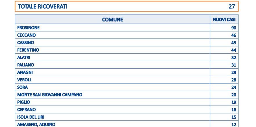 Frosinone conta 90 contagi, Ceccano 46, Cassino 45, Ferentino 44. 67 i comuni ciociari coinvolti.