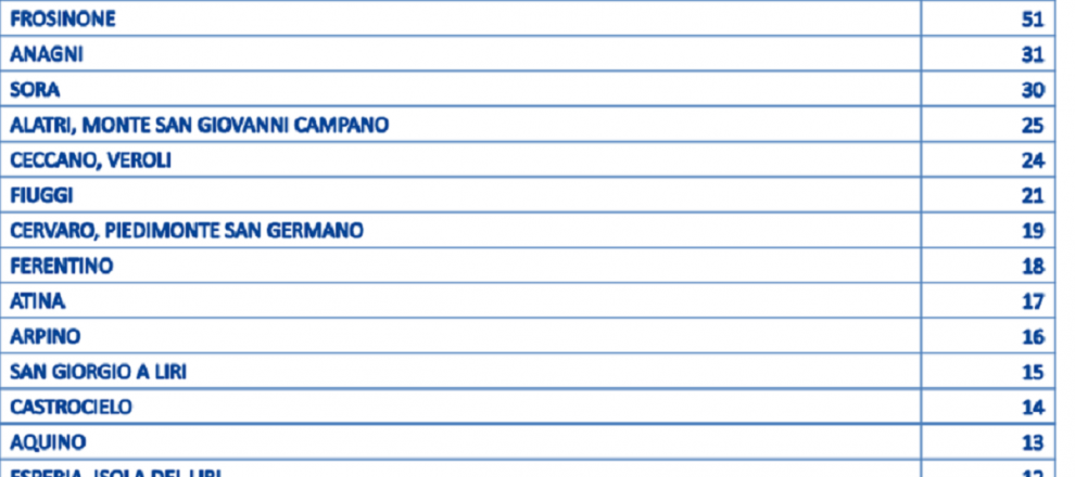 19 a Cervaro a Piedimonte. 18 Ferentino. 17 Atina. 16 Arpino. 15 San Giorgio. 14 Castrocielo.13 Aquino. 12 Esperia e Isola del Liri. 11 Castelliri, Piglio e Sant’Elia Fiumerapido.