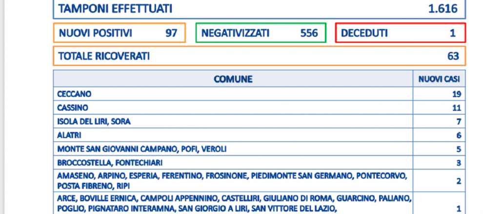 Sono 97 i casi di positività al Covid in Ciociaria. Sono 1616 i tamponi processati. L’indice è al 6 per cento. Si registra il decesso di un uomo di 85 anni residente ad Anagni con pregresse patologie.