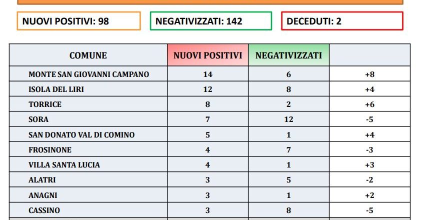 Tra i comuni con più positività c’è Monte San Giovanni Campano con 14, Isola del Liri con 12, Torrice con 8 e Sora con 7.