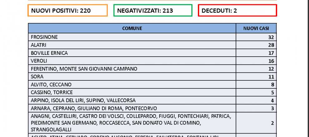 Sono 220 i nuovi positivi in Provincia di Frosinone su 2764 tamponi processati. il rapporto è al 7,9%.