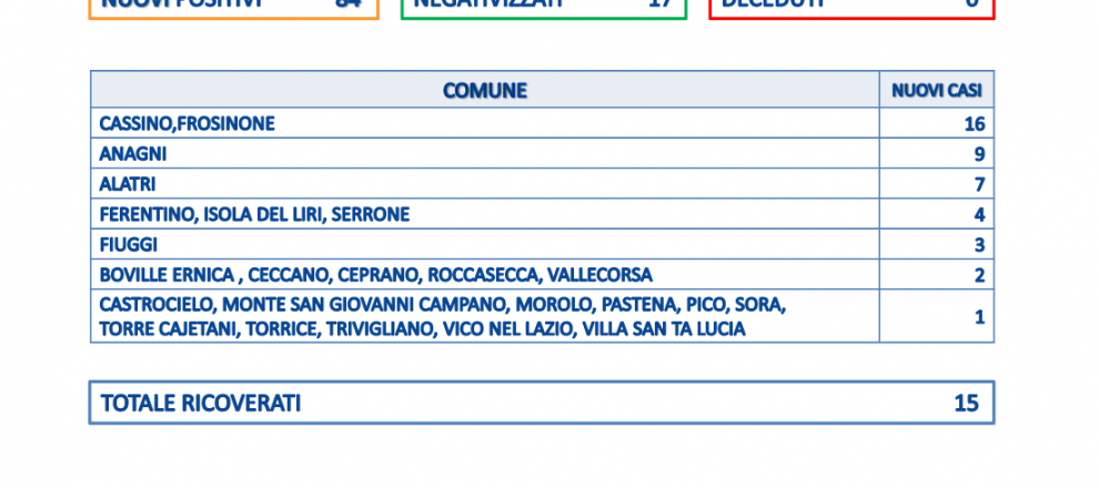 A Cassino e Frosinone ci sono 16 positivi a testa. Nove i contagi ad Anagni, sette ad Alatri.