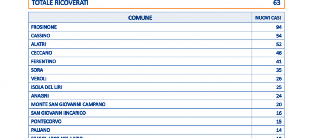A Frosinone ci sono 94 casi , 54 a Cassino, Alatri 52, Ceccano 46, 41 Ferentino, Sora 35, 26 Veroli, 15 Isola del Liri.24 Anagni, 20 Monte San Giovanni Campano, 16 San Giovanni Incarico, 15 A Pontecorvo.