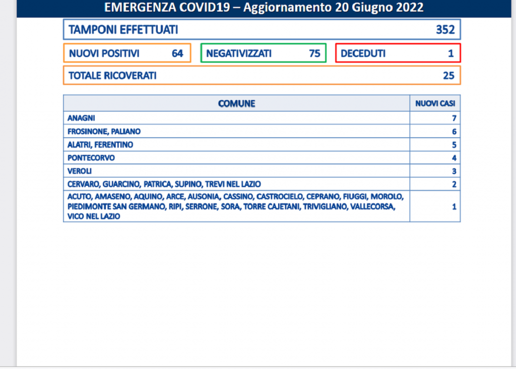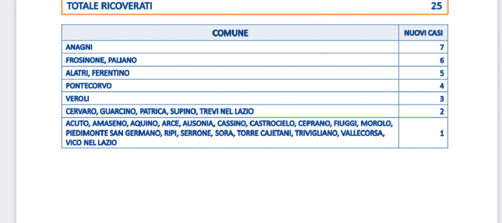 Anagni è la città con più contagi di giornata, 7. 6 i casi nel capoluogo e a Palinao. 5 ad Alatri e Ferentino. 4 a Pontecorvo. 3 a Veroli.