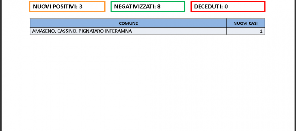 Covid – In Ciociaria tre nuovi positivi. Nessun decessoDalle Province, In primo piano3 Luglio 2021 3 Luglio 2021 Nelle ultime 24h sono stati effettuati 613 tamponi in provincia di Frosinone.Registrati 3 nuovi casi di positivi al Sars-CoV-2.I negativizzati sono 8. Non ci sono decessi. I tre casi sono stati registrati ad Amaseno, Cassino e Pignataro Interamna Condividi sui social: Share on Facebook Share on WhatsApp Share on X (Twitter) Share on LinkedIn Share on Email Share on Telegram Navigazione articoli Previous Post Calcio – Atletico Fiuggi, sulla panchina ci sarà Fabrizio RomondiniIn primo piano, Sport3 Luglio 2021Next Post Calcio – Per la Roma di Mourinho ipotesi test allo Stirpe di Frosinone contro il CraiovaIn primo piano, Sport3 Luglio 2021