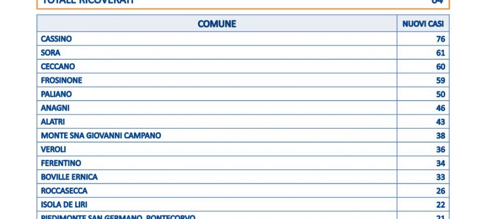 E’ Cassino con 76 la città che conta più contagi, seguono Sora con 61, Ceccano con 60. Sono 59 a Frosinone, 50 a Paliano, 46 ad Anagni e 43 ad Alatri. Sono 75 i comuni da 38 a 1 positivo.
