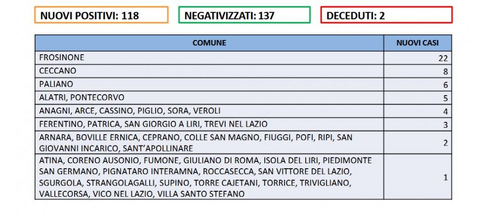 Due decessi e 118 nuovi casi in provincia di Frosinone dove influisce l’effetto lunedì. Il tasso di positività si attesta al 14% a fronte dei soli 842 tamponi processati domenica. 137 sono i guariti, stabili a 65 i ricoveri. Le vittime sono un uomo di 84 anni di Castrocielo e un uomo di 89 di Ferentino.