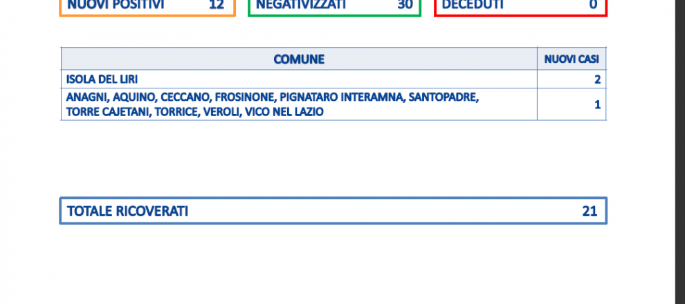 Sono  12 nuovi casi di positivi al Covdi in Ciociaria. I tamponi processati dalla Asl sono stati 345. Il rapporto si attesta al 3,4 per cento.