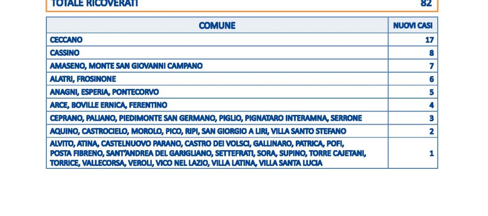 La città con più contagi è Ceccano con 17, segue Cassino con 8, Amaseno e Monte San Giovanni Campano con 7, Alatri e Frosinone con 6. 38 comuni da 5 a 1 caso.