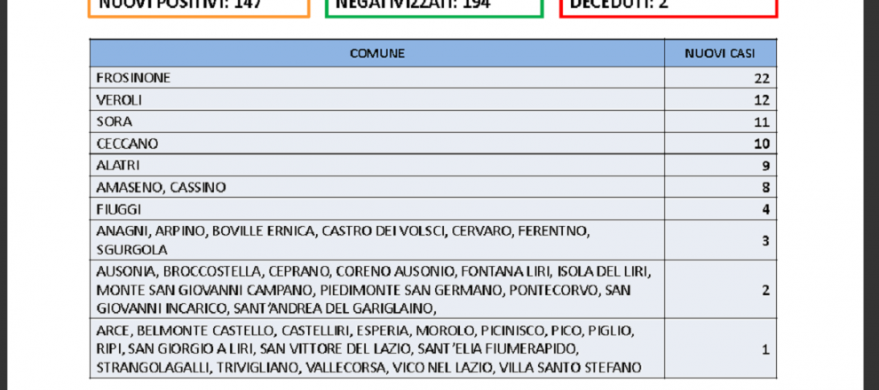 Frosinone torna in testa per il numero dei casi giornalieri:22. Seguono Veroli con 12 e Sora con 11.