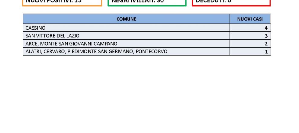 Sono 4 i casi a Cassino; 3 a San Vittore del Lazio; 2 ad Arce, Monte San Giovanni Campano e 1 ad Alatri, Cervaro, Piedimonte San Germano, Pontecorvo.