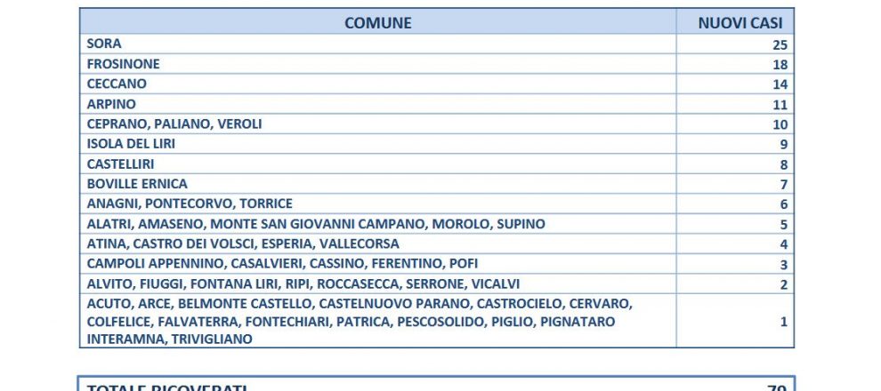 è Sora la città con più positivi: 25, segue Frosinone con 18, Ceccano con 14, Arpino con 11; Ceprano, Paliano e Veroli con 10. Poi 9 a Isola del Liri, 8 a Castelliri, 7 a Boville Ernica.