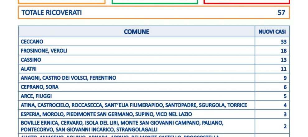 In provincia di Frosinone zero decessi e 227 nuovi casi su 1.577 tamponi, il tasso di positività è al 14,3%. Sono 557 i guariti, 57 ricoveri.
