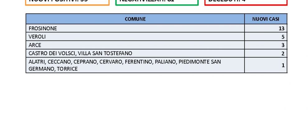 Quasi un terzo dei casi giornalieri è stato registrato nel Comune di Frosinone: 13 positività. Segue Veroli con 5 e Arce con 3.