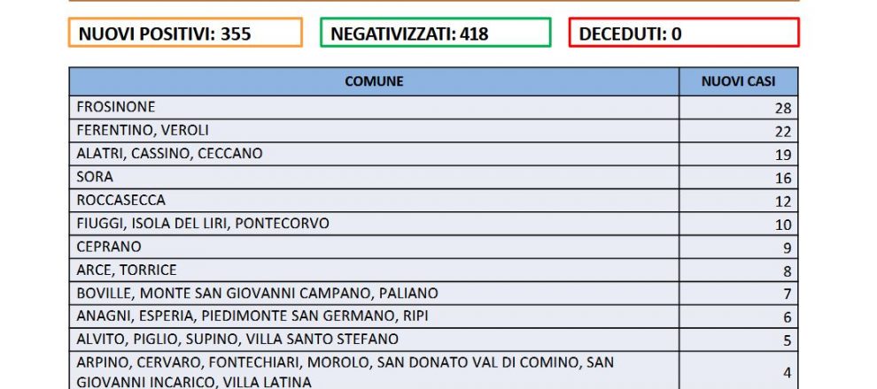 In provincia di Frosinone 355 nuovi positivi emersi su 2554 tamponi, il tasso di positività si attesta al 13,8%. I guariti sono 418, stabili a 65 i ricoveri.