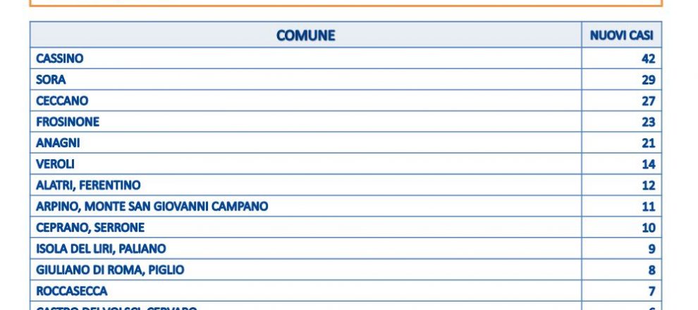 La città con più casi è Cassino con 42, seguono Sora con 29, Ceccano con 27, Frosinone con 23, Anagni con 21. Sono 63 i comuni ciociari che contano almeno un contagio.