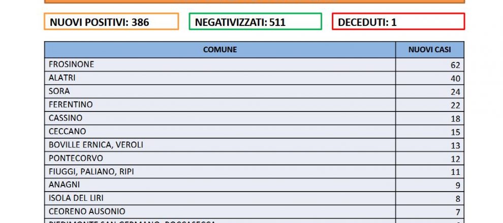 In provincia di Frosinone 386 nuovi casi emersi su 2882 tamponi processati, il tasso di positività è al 13.39%. C’è un decesso: si tratta di una donna di 59 anni di Isola del Liri.