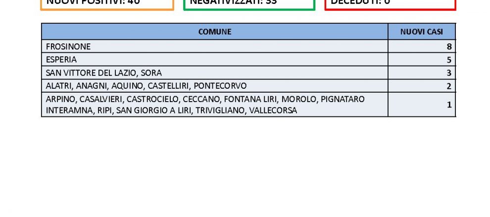 Zero decessi e 40 nuovi casi positivi emersi su 543 tamponi effettuali. questa la situazione in provincia di Frosinone dove nelle ultime 24 ore ci sono stati anche 33 negativizzati.