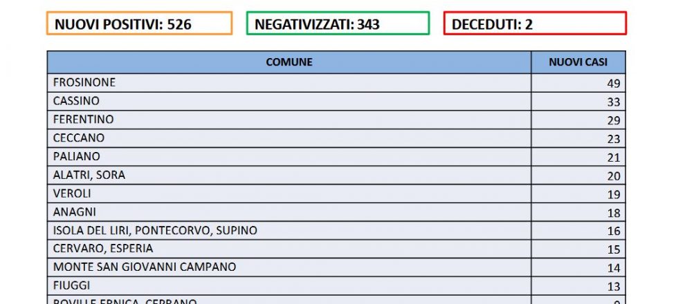 Altri due decessi in provincia di Frosinone dove i nuovi positivi sono 526 emersi su 2693 tamponi. Il tasso di positivista è stabile al 19,5%. Le vittime sono una donna di 79 anni di Castrocielo e un uomo di 86 anni di Ferentino. 343 i guariti, stabili a 62 i ricoverati.