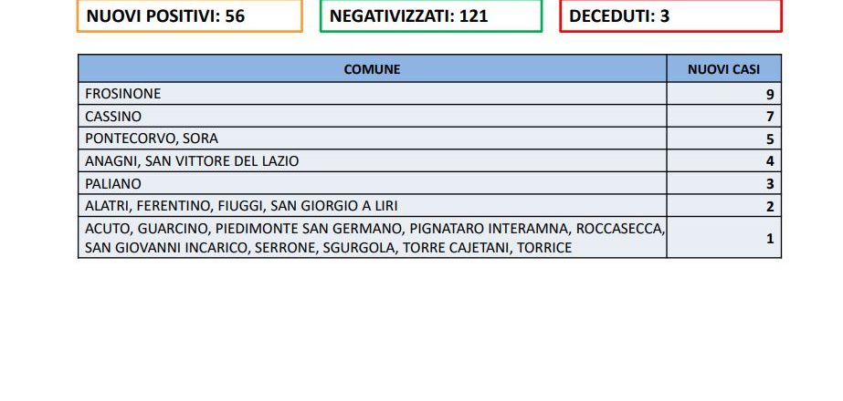 Oggi in provincia di Frosinone ci sono 56 nuovi casi su 2.344 tamponi effettuati. I negativizzati sono 121.