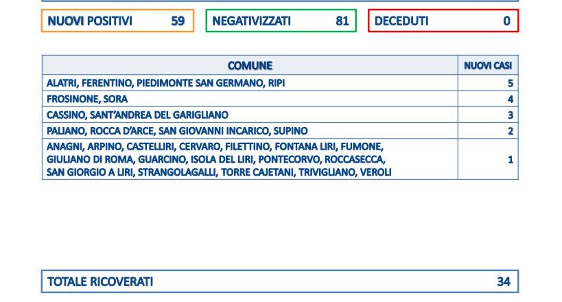 In provincia di Frosinone il numero dei guariti, 81, supera quello dei positivi 59 emersi su 1084 tamponi effettuati. Il tasso di positività si attesta al 5.4%. Stabili i ricoverati a 34.